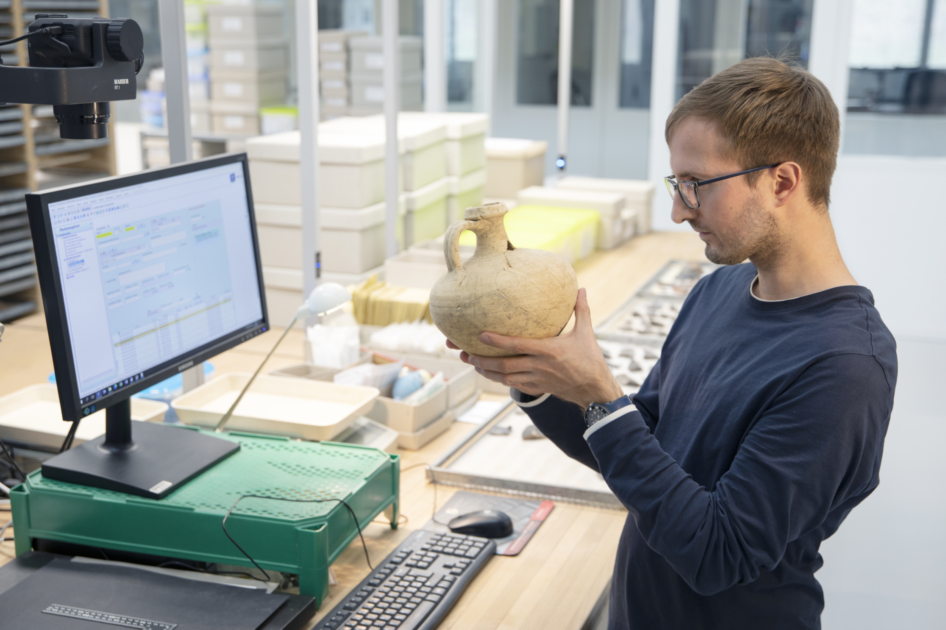 Nous sommes responsables de la conservation et la restauration des objets archéologiques déterrés ainsi que de la préservation de leur substance originale et de leur authenticité. Nous définissons la manière dont ils doivent être transportés, emballés et gardés afin de garantir leur conservation. Nous travaillons en étroite collaboration avec les autres départements : sur les fouilles et pour la collection, en cas de prêts ainsi que durant les expositions, les projets de recherche et les offres de transmission des connaissances. Notre équipe se compose de conservateurs et conservatrices ainsi que de restaurateurs et restauratrices diplômés.