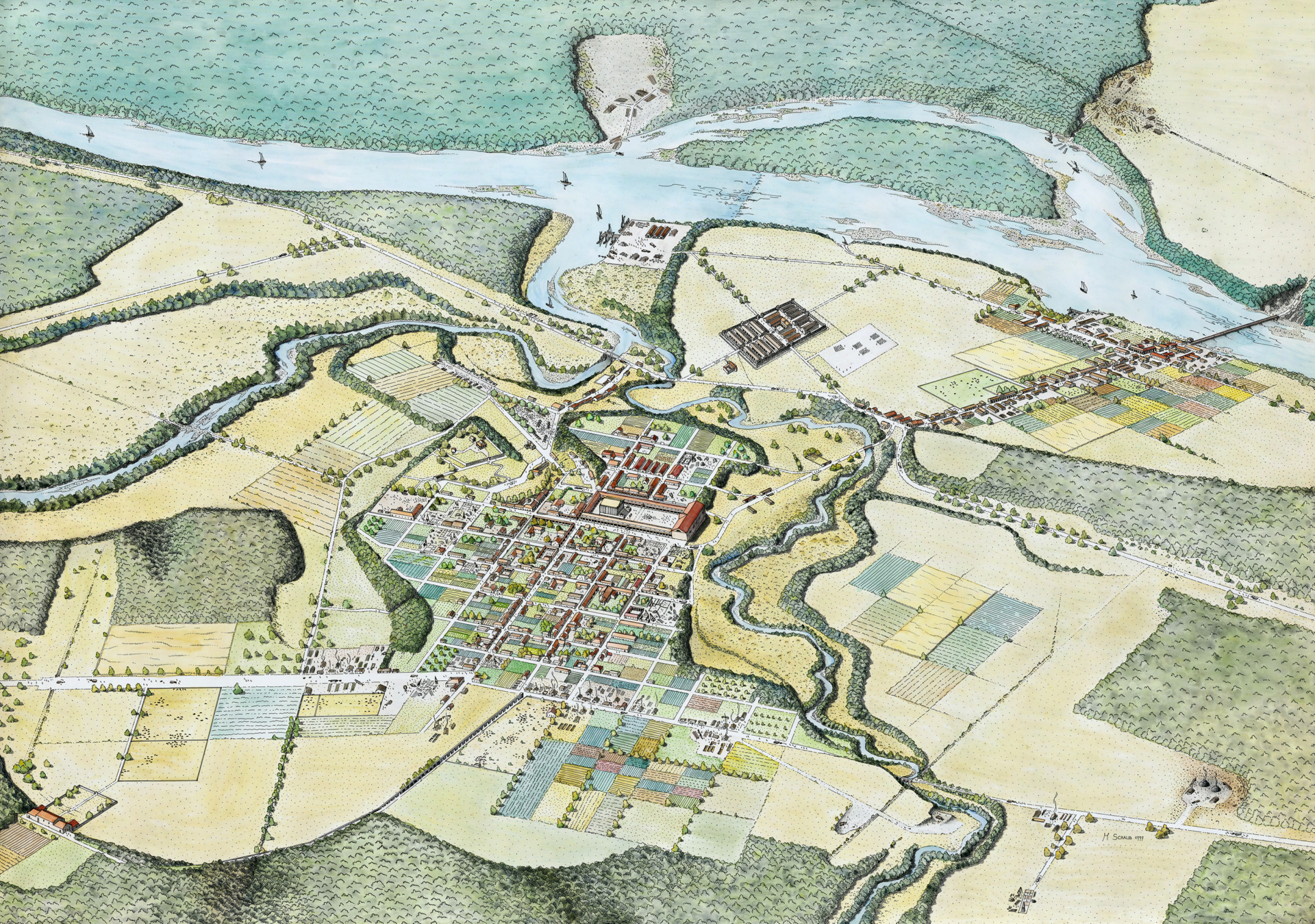 Plusieurs décennies s’écoulèrent entre l’acte de fondation et la construction de la ville. Ce délai pourrait être dû aux guerres civiles qui éclatèrent en Italie à la mort de César. C’est seulement sous le règne de l’empereur Auguste, vers 15 av. J.-C., qu’une seconde fondation eut lieu et que les travaux commencèrent. La ville haute fut édifiée sur une terrasse de faible altitude tandis qu’un camp militaire était bâti au bord du Rhin (ville basse). Les constructions de l’époque étaient principalement en bois.
