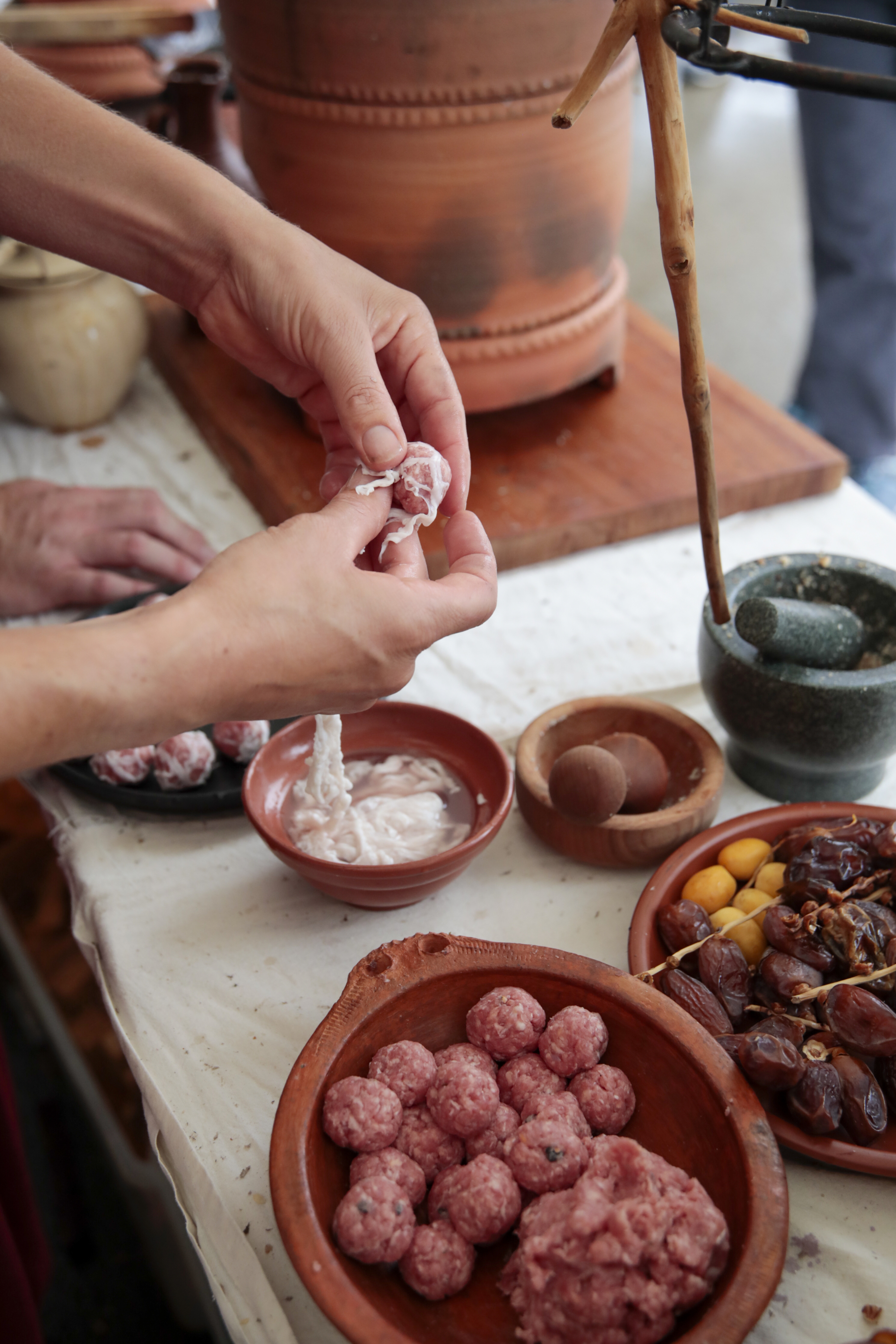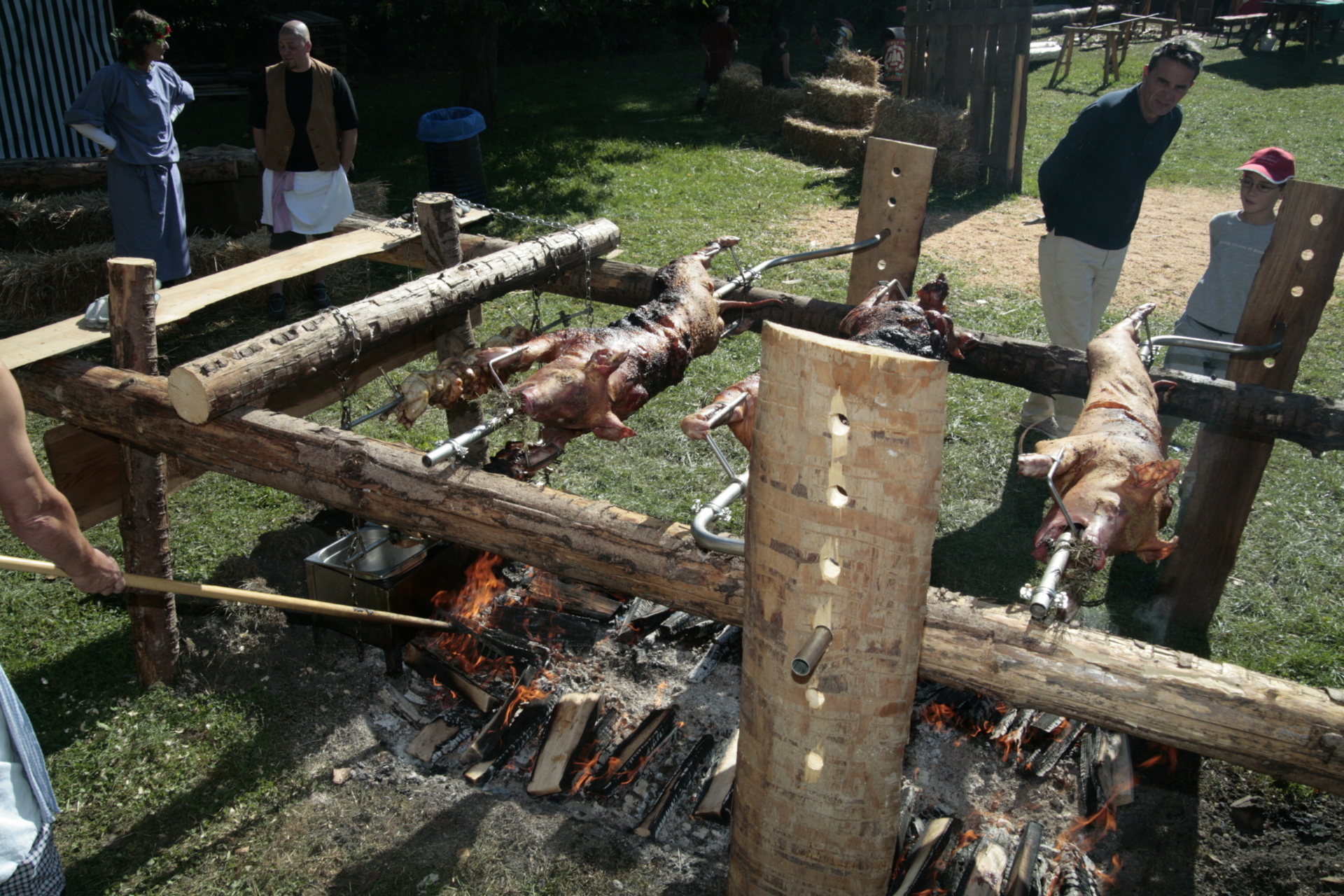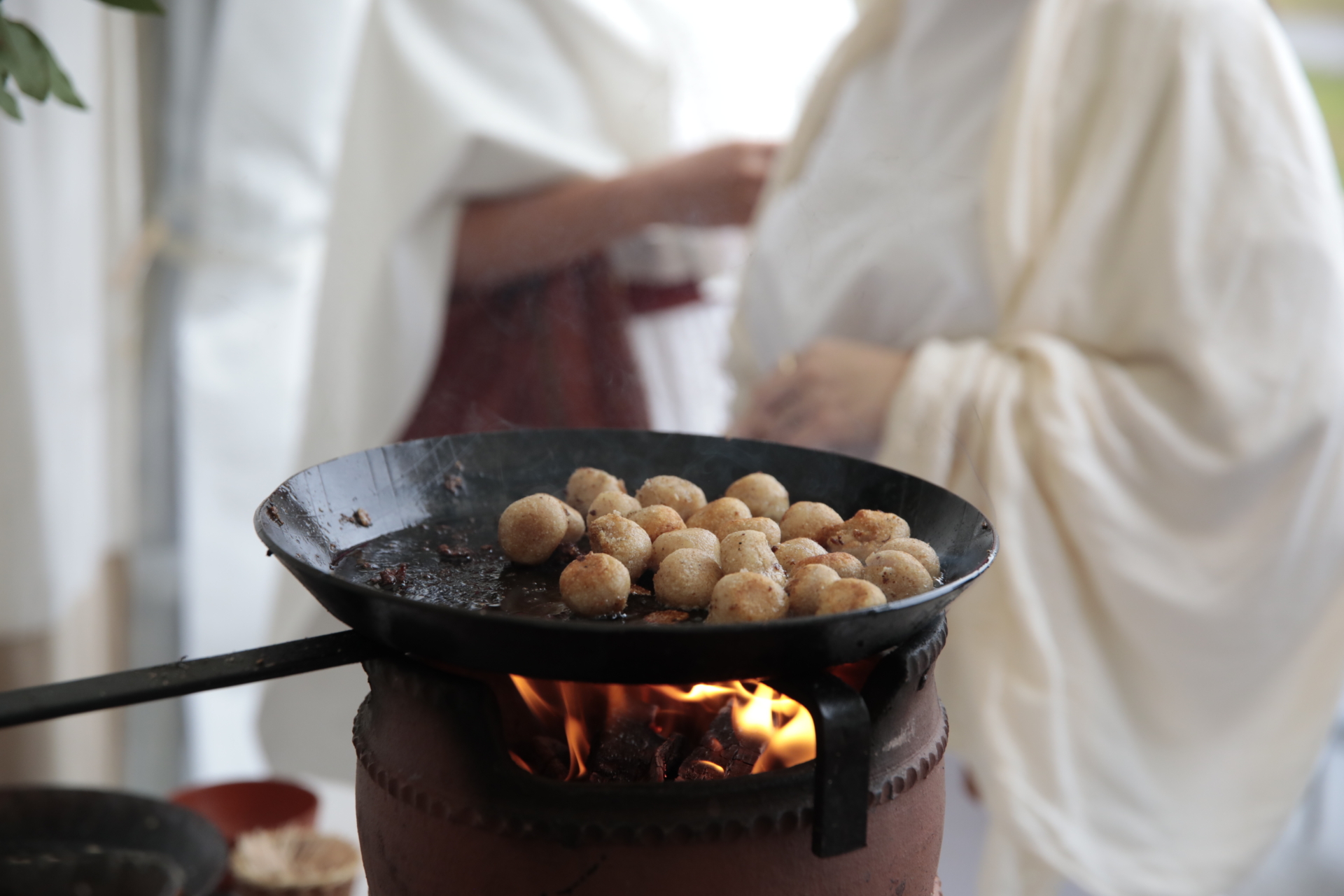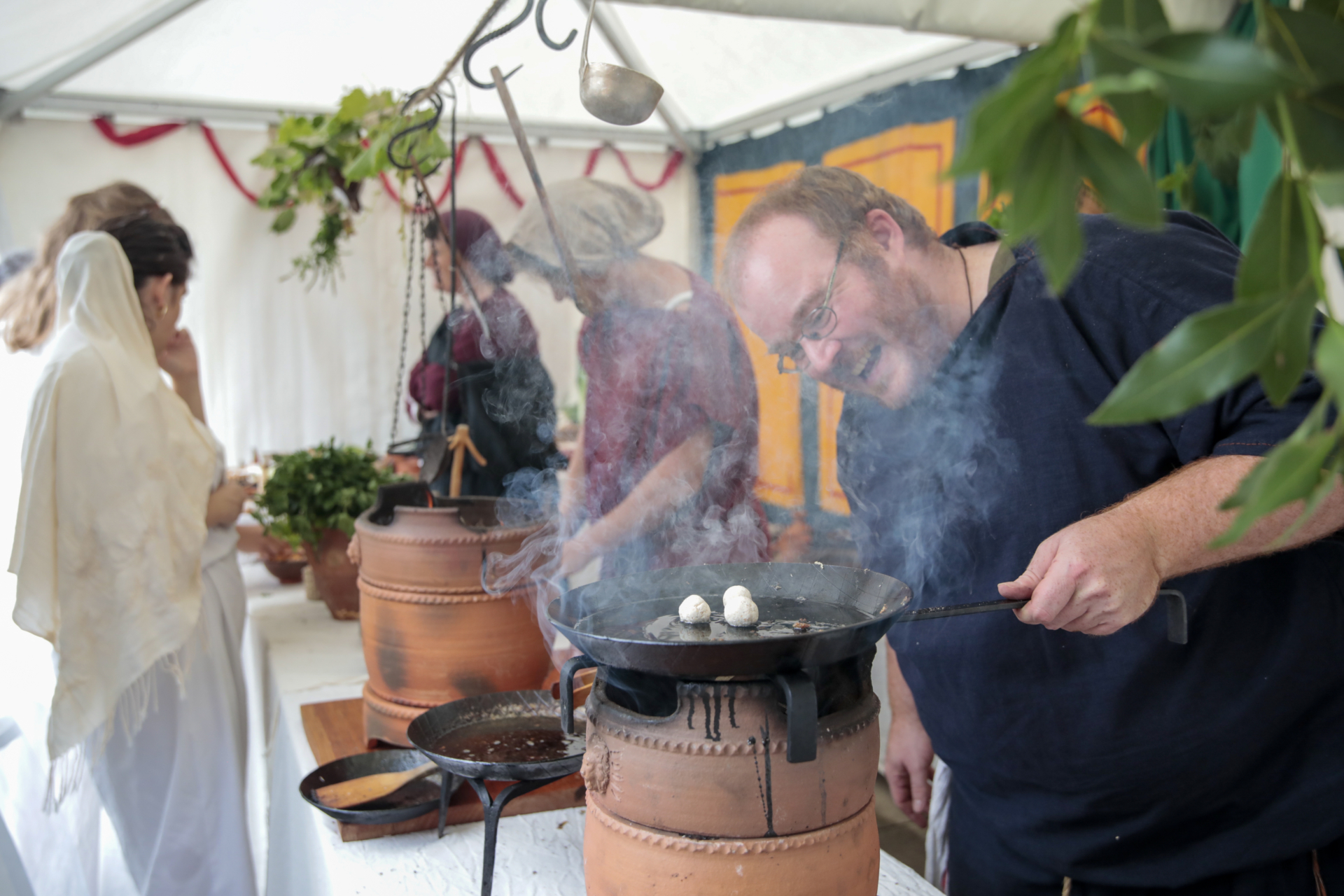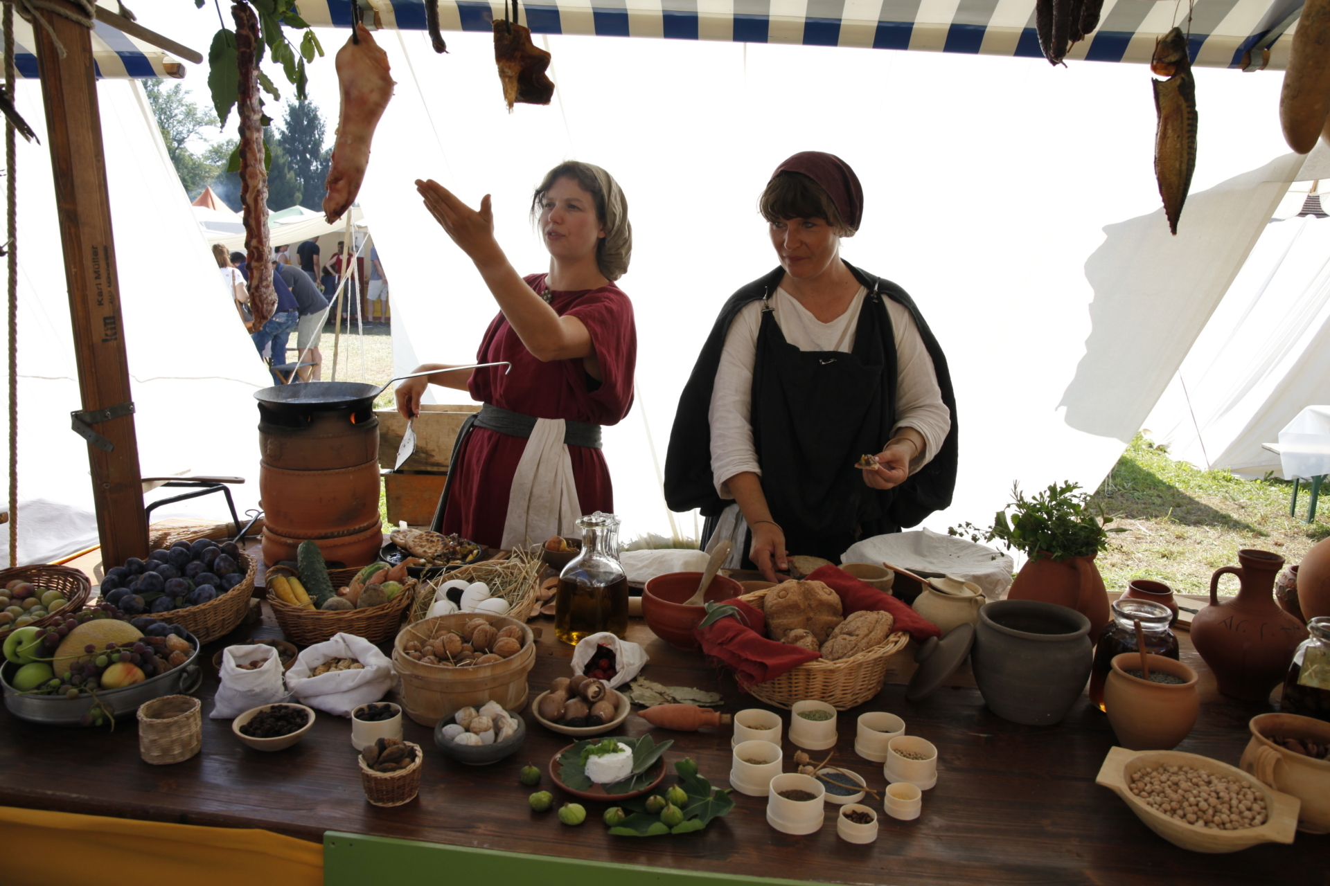 Lors de la fête romaine, savourez la cuisine romaine sous toutes ses facettes : Rôtis, poulets parthes et saucisses à rôtir lucaniennes, fabriqués spécialement pour la fête romaine, vin de baies, mulsum, ragoûts romains et moretum.
