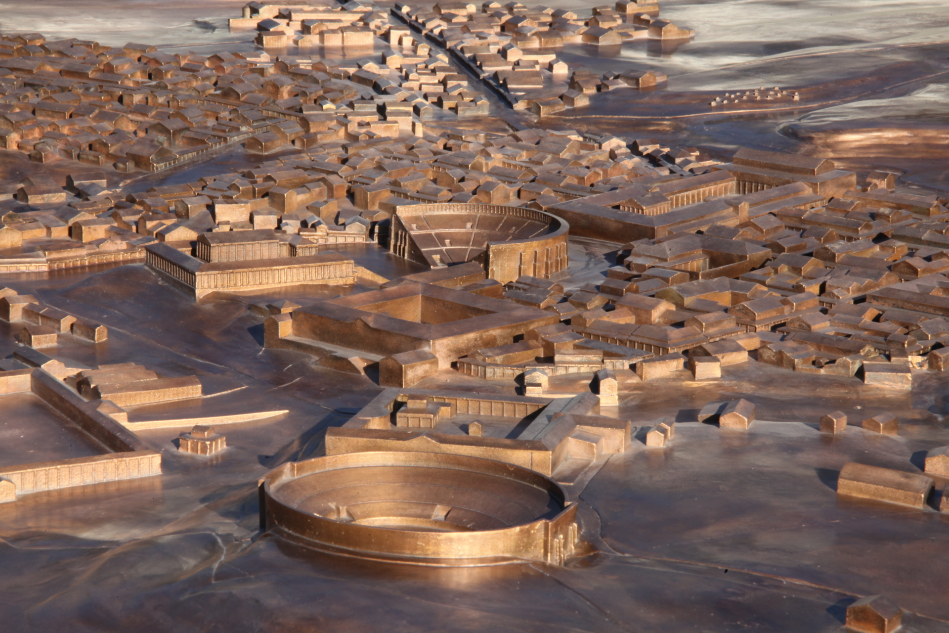 D’une surface de 13 m2 et pesant 1,2 tonnes, elle offre aux visiteurs une vision étonnante de la taille et de la somptuosité de l’ancienne métropole. Elle permet de voir – et de toucher – le temple, le théâtre, le quartier des villas ainsi que celui des artisans – et naturellement toutes les infrastructures associées qui firent la gloire des Romains.