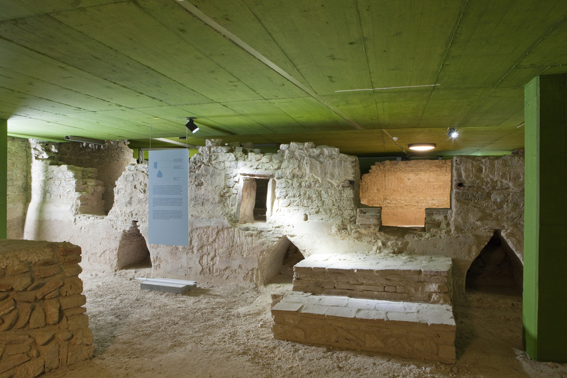 L’imposant complexe thermal de Kaiseraugst fut découvert lors de la construction d’un jardin d’enfants. Une partie est encore accessible au public. Les visiteurs peuvent parcourir le sous-sol des pièces, au niveau de l’hypocauste où circulait l’air chaud parmi de petits piliers supportant le sol des pièces chauffées et construites au-dessus.