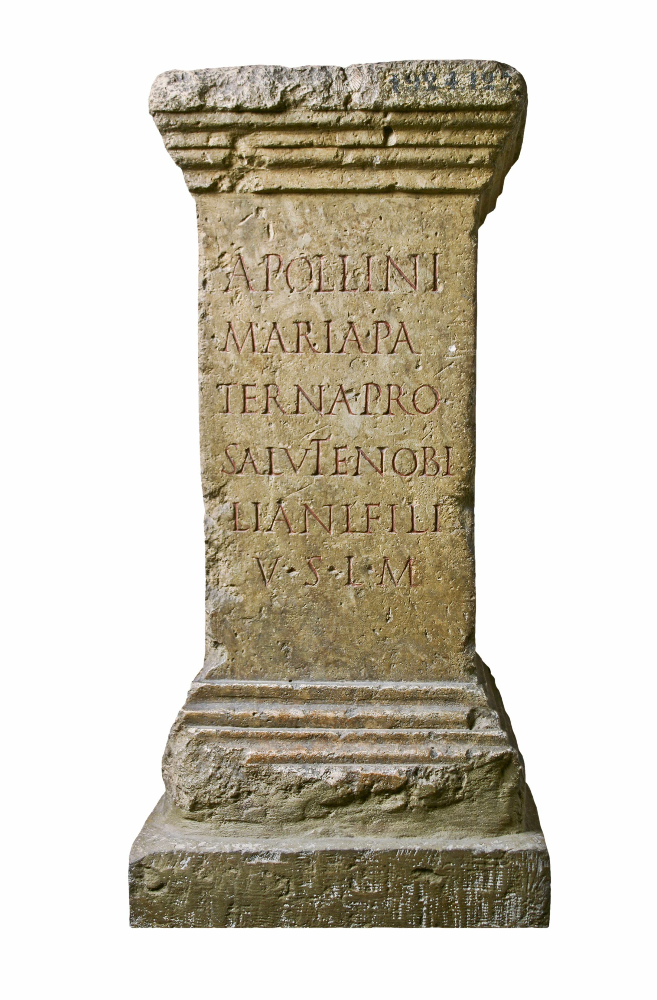 «Ich bin Maria Paterna, eine Römerin keltischer Herkunft, das erkennt man an meinem Namen. Meine Vorfahren waren Einheimische, denen das römische Bürgerrecht verliehen wurde. Ich stifte Apollo, dem Gott der Heilkunst, für die Genesung meines Sohnes einen Altar. Genau wie ich es den Göttern feierlich versprochen habe, als Nobilianus so schrecklich krank war! Den Quader für den Altar habe ich aus den Steinbrüchen des Birstals bezogen und nun setzt ein versierter Steinbildhauer die Inschrift – alles kostspielig und ganz so, wie es sich für die Gabe einer wohlhabenden Familie gehört».