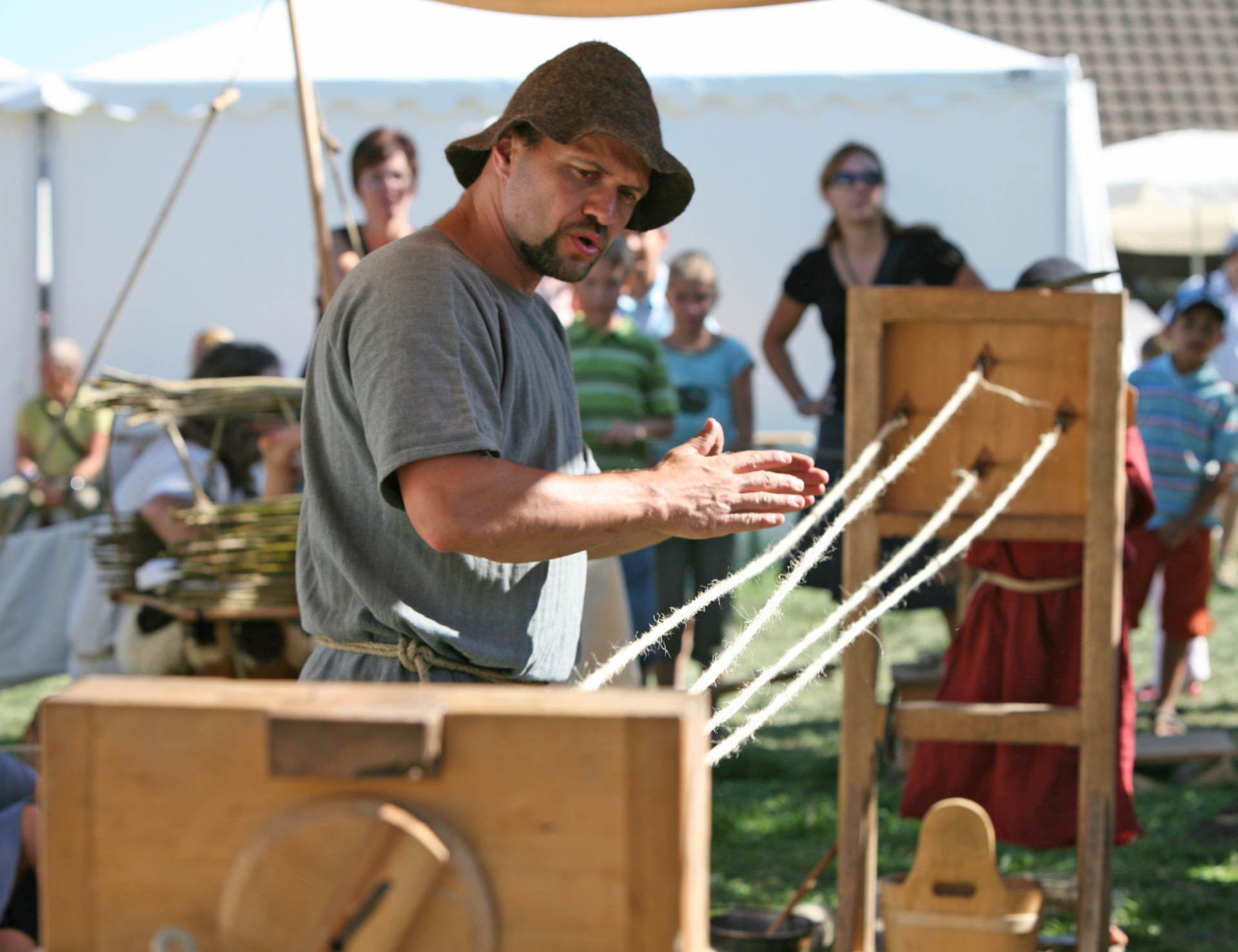 Römische Handwerkerinnen und Handwerker lassen dich hautnah an der antiken Alltagskunst teilhaben. Beobachte, wie ein Seil oder ein bunt gefärbtes Tuch entsteht. Entdecke die Modetrends der Antike, erlerne Techniken des Feuermachens oder vergnüge dich bei römischen Knobelspielen.