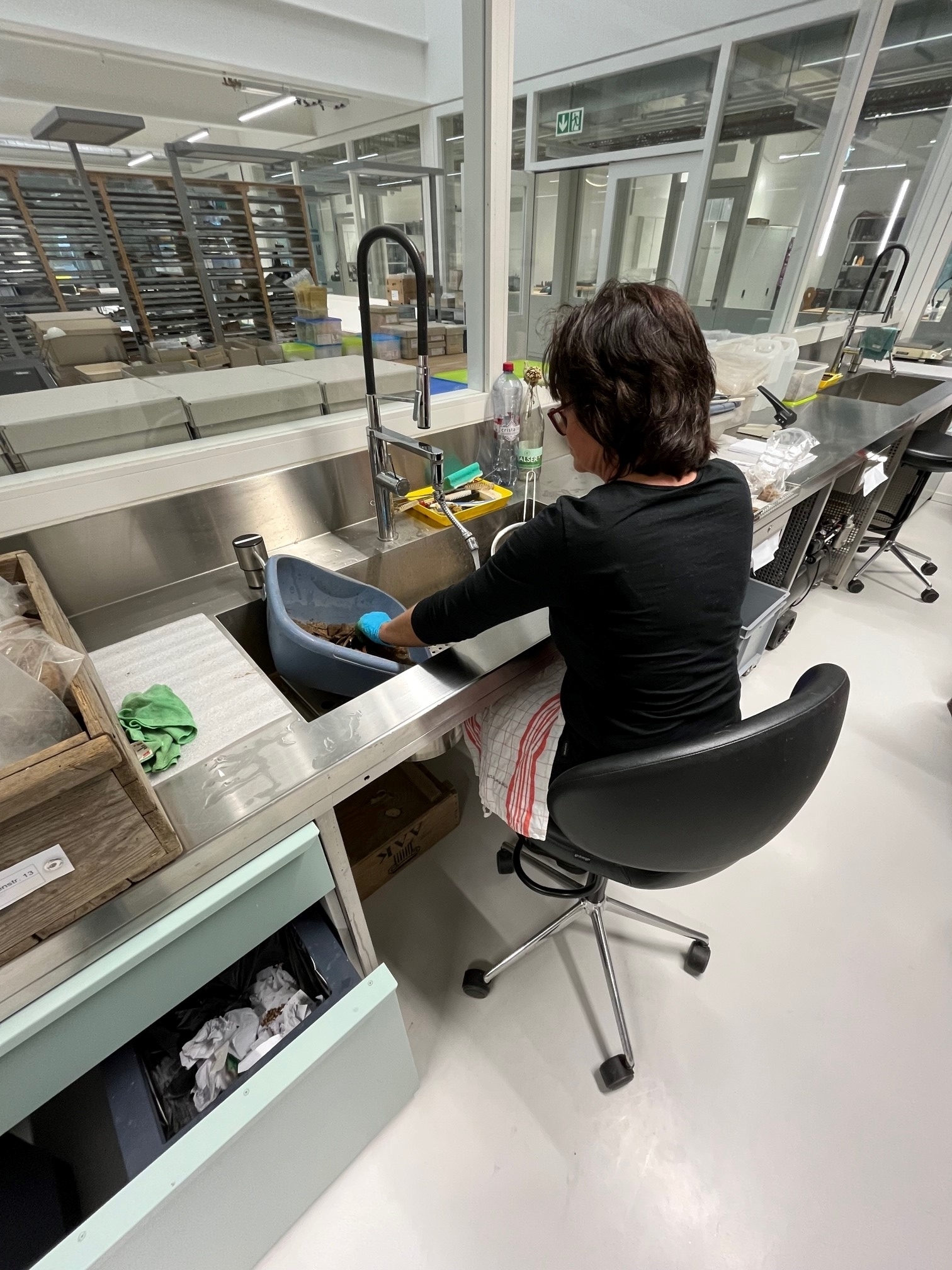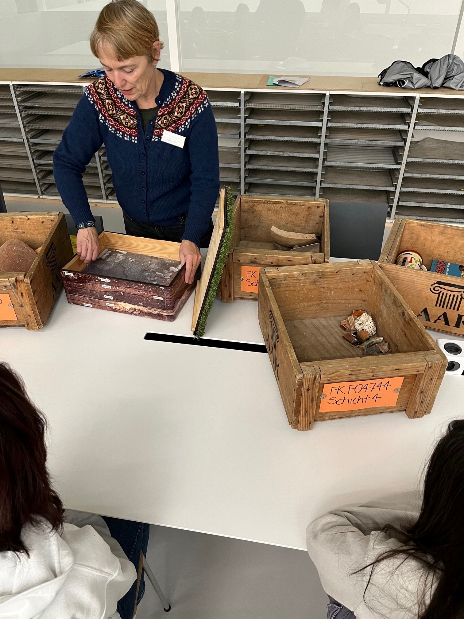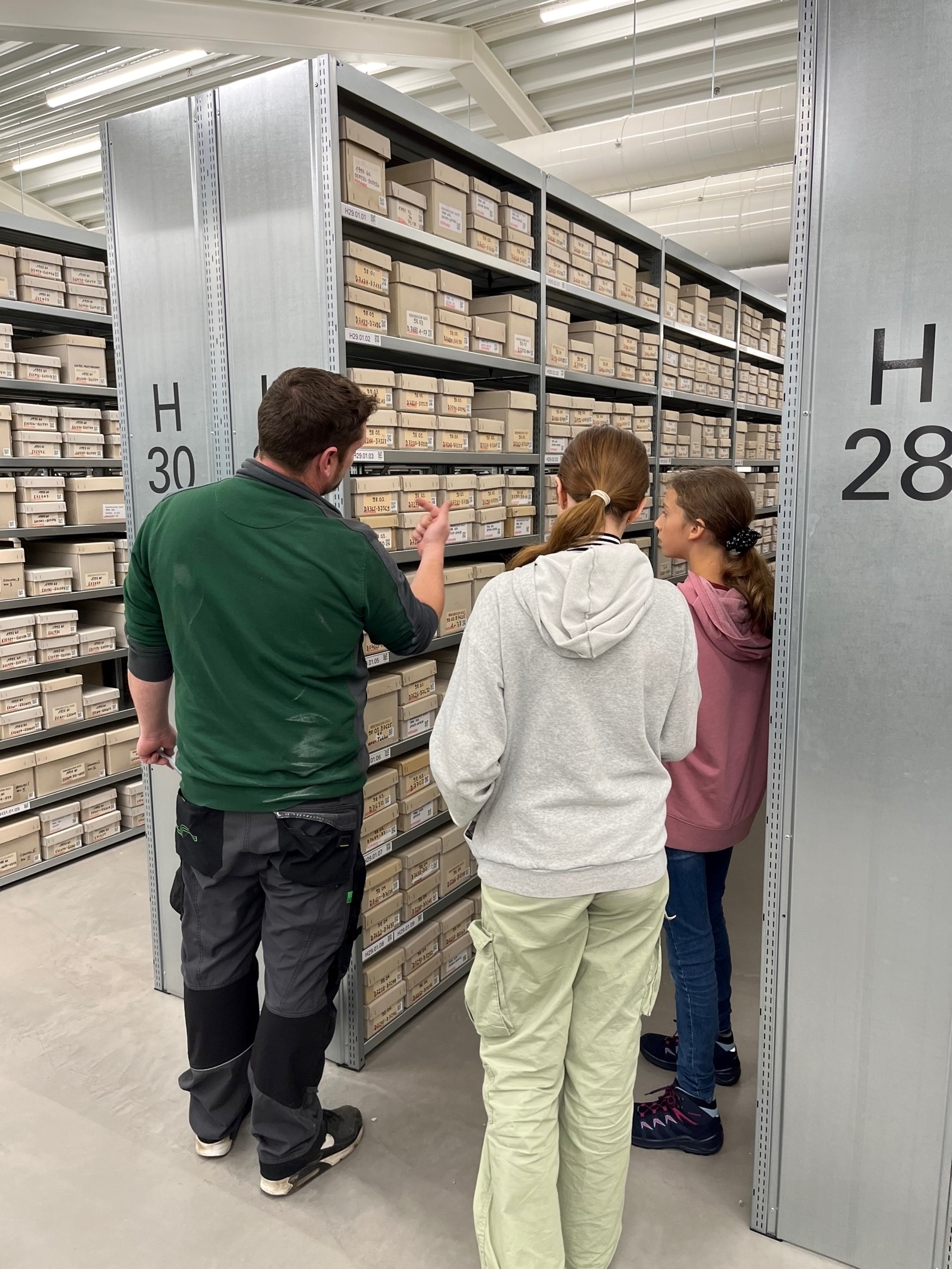 Endlich wieder Zukunftstag! In Augusta Raurica wuselten 16 Mädchen und Jungen durch den Betrieb und absolvierten einen Parcours durch verschiedene Abteilungen und Berufe. Sie durften zum Beispiel auf Schatzsuche gehen und anhand einer Nummer selber Fundstücke suchen und wiederfinden, die in den unglaublich vielen Schachteln auf den zahlreichen Regalen im neuen Funddepot einsortiert sind. Aufgrund des neuen übersichtlichen Ordnungssystems und mit etwas Unterstützung von Tobias Brodmann, Logistiker in unserem Betrieb, hat dies wunderbar geklappt. Die Leiterin der Sammlung, Sandra Ammann, erläuterte anhand von originalen römischen Fundstücken, wie sorgfältig und geschickt die Römer:innen töpferten und wie detailliert Reliefgefässe verziert wurden. Die Mädchen und Jungen hatten dabei auch die Möglichkeit zu erfahren, wie Fundobjekte gewaschen und inventarisiert werden.