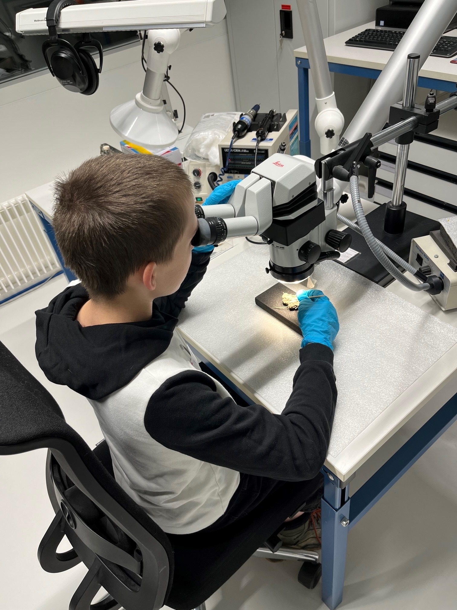 In der Fundrestaurierung durften die Jugendlichen bei der Leiterin Maya Wartmann an Repliken üben, wie Fundstücke aus Grabungen sorgfältig freigelegt werden. Unsere Fotografin Susanne Schenker zeigte den Jugendlichen, was alles nötig ist, um im Fotostudio Fundobjekte perfekt in Szene zu setzen und aufzunehmen. Anschliessend durften die Schüler:innen selber Fundstücke und Portraits aufnehmen, belichten und mit Photoshop bearbeiten.